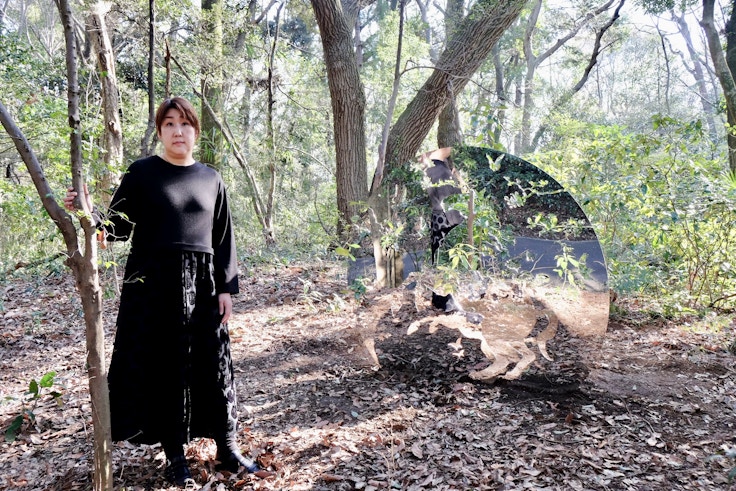 松山は本作についてこう述べる。「神の遣いともされる鹿と、神道と関わりが深い銅鏡に見立てた車のホイール、その有機的なフォルムと人為的なフォルムを組み合わせてコントラストをつくり出した。鏡面に映り込む荘厳な森と、人工物とのコントラストにも注目してほしい。アートと社会との接続を、明治神宮が象徴するような日本の近代化といった要素も加味しながら表現した」。
