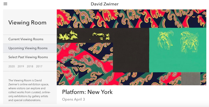ギャラリーは閉鎖、アートフェアはキャンセルを余儀なくされる状況を受け、デイヴィッド・ツヴィルナーが小規模ギャラリーの救済に名乗り出た。2017年よりデイヴィッド・ツヴィルナーは「ビューイング・ルーム」という、オンラインの作品販売を行ってきた。同ギャラリーは、新型コロナウイルスの影響で、展示の中止や早期終了に追い込まれたニューヨークの小規模ギャラリー12軒に対し、このプラットフォームの利用を開放するという。各ギャラリーは2点ずつ「ビューイング・ルーム」経由で、作品の展示・販売ができ、デイヴィッド・ツヴィルナー側は、システムの利用料やコミッションは一切受け取らないという。このセールは「プラットフォーム:ニューヨーク」と銘打たれ、4月3日よりスタートする。
