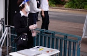 再開当日のゲートでは、来館者の予約情報を確認するスタッフとともに、非接触式の体温計で来館者の体温を確認するスタッフも待機。来館者とやり取りを行うスタッフは、マスクとともにフェイスシールドやビニール製の手袋を着用して、感染防止に務めていた。