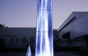 今回設置されたのは、《空から降り注ぐ憑依する滝》。地面から天に向かって伸びる柱のような本作は、4面すべてが映像となっており、そこには平面化した滝がつねに流れ落ちる。また、この映像は地面にもつながり、人が近づくことによって水の流れは影響を受け、変化する。