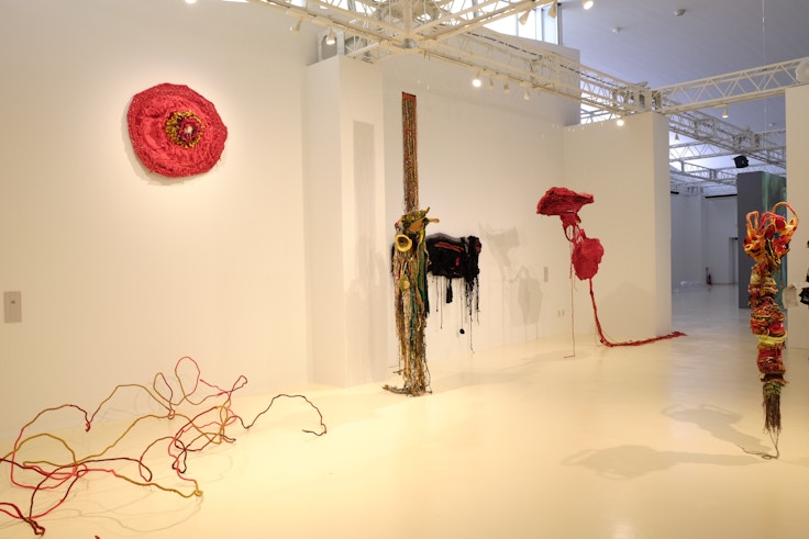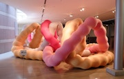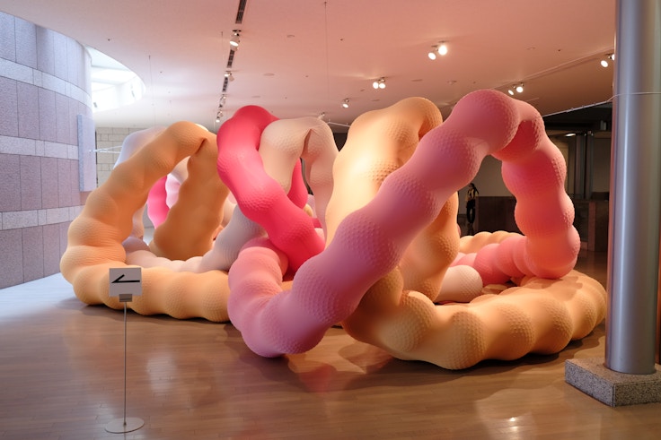 3階通路でひときわ目を引くのが、腸のようなシルエットで横たわる、柔らかな素材でつくられたエヴァ・ファブレガスによる巨大な立体作品《からみあい》(2020)だ。ラクス・メディア・コレクティヴはこの造型から、腸内細菌がつくり出す世界を想像し、体内の1000腸個の細菌に思いを馳せながら、展示をキュレーションしたという。
