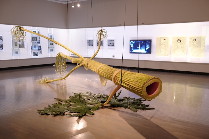インゲラ・イルマンも、巨大な立体作品《ジャイアント・ホグウィード》(2016/2020)を展示している。これは中央アジア原産の植物、ジャイアント・ホグウィード(和名:バイカルハナウド)を巨大化させたもの。19世紀に観賞用として世界中に広まりながらも、触るとかぶれを引き起こす毒性を持ったこの植物の姿を通して、美しさと毒の共生について考える契機を提供する。上述の《からみあい》や本作は、「ソース」のひとつである「毒──世界に否応なく存在する毒と共存する」とつながるものだろう。