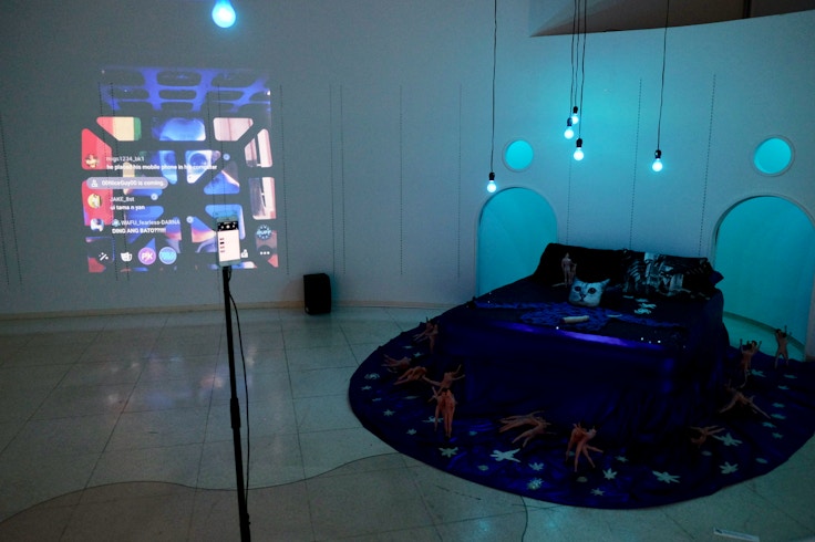 中国のソーシャリー・エンゲージド・アートにおいて注目を集めてきた鄭波(ジェン・ボー)の映像作品「シダ性愛」シリーズ(2016〜)は、シダ植物と男性たちとの性的な交流が疑似体験として描かれる。ラス・リグタス《プラネット・ブルー》(2020)も、ウェブ配信上でのコミュニケーションを思わせる映像作品とダブルベッド、裸の男女の人形などを組み合わせ、現代における性について考える契機が提供されている。