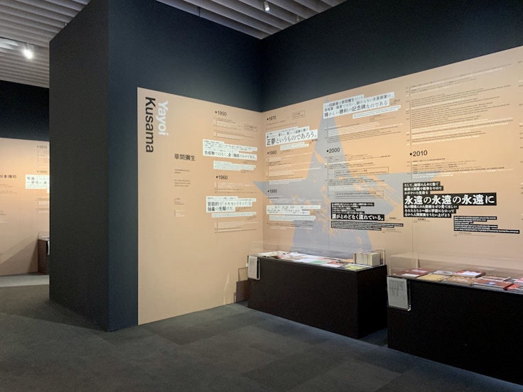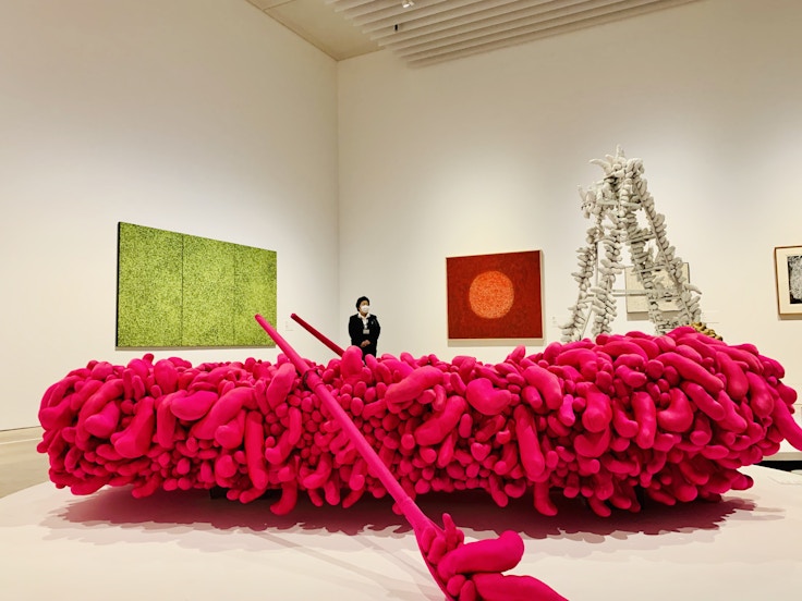 本展においては、草間がニューヨークを拠点としていた1960年頃の初期作品から、93年のヴェネチア・ビエンナーレ日本館代表として出品した《天上からの啓示(B)》(1993)やファルス(男根)で覆われた立体作品3点、ミラールームなどを展示。草間の活動が凝縮された空間となっている。