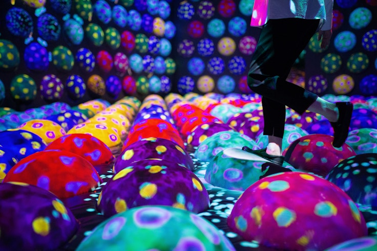 このフィールドの特徴は、なんといっても「身体性を強く意識させること」だ。例えば《高速回転跳ね球のあおむしハウス》は、チームラボが開発した多様な色に光る「高速回転跳ね球」で埋め尽くされた空間。