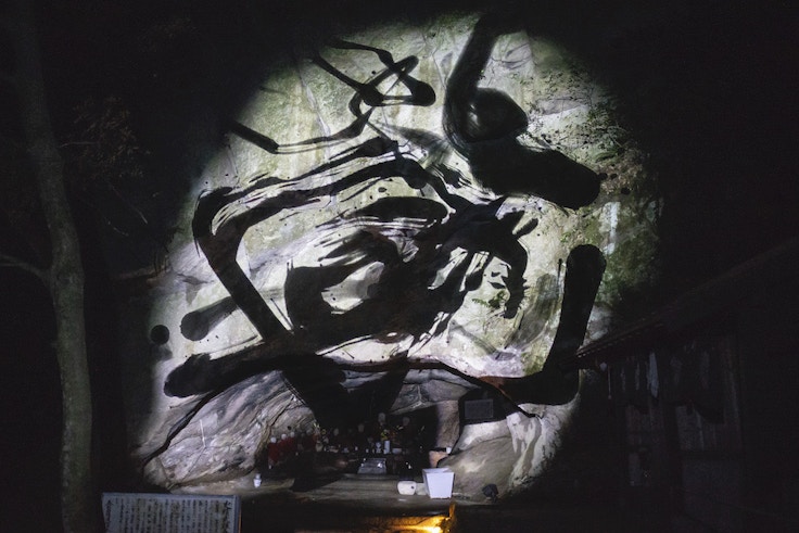 御船山には、約1300年前に名僧・行基が入山し、3つの洞窟に五百羅漢を彫り安置し、三仏体を洞窟の奥岩に刻んだという言い伝えがある。この三仏体がある洞窟には、チームラボが設立以来続けている空間に書く書「空書」を展示。連綿と続く御船山楽園の歴史をもっとも強く感じられる場所だ。
