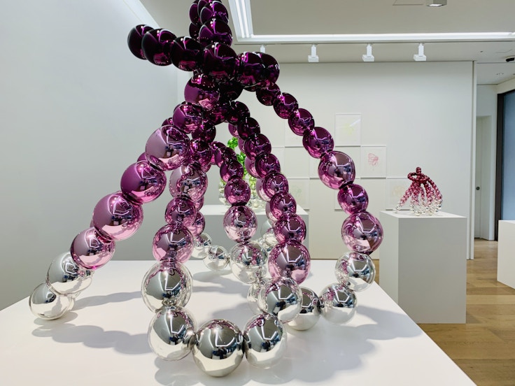 「Kiku」シリーズは菊の花の形状を抽象化したものであり、色も菊の花に着想を得た。作品は一筆書きのようにガラスピースがつながっており、覗き込めば鑑賞者や周囲の風景とともに、その作品自体をも映し出す。「永遠が重要なコンセプトなのです。この形状は、エネルギーが終わることなく続いていくことを意味しています」。