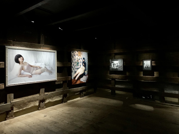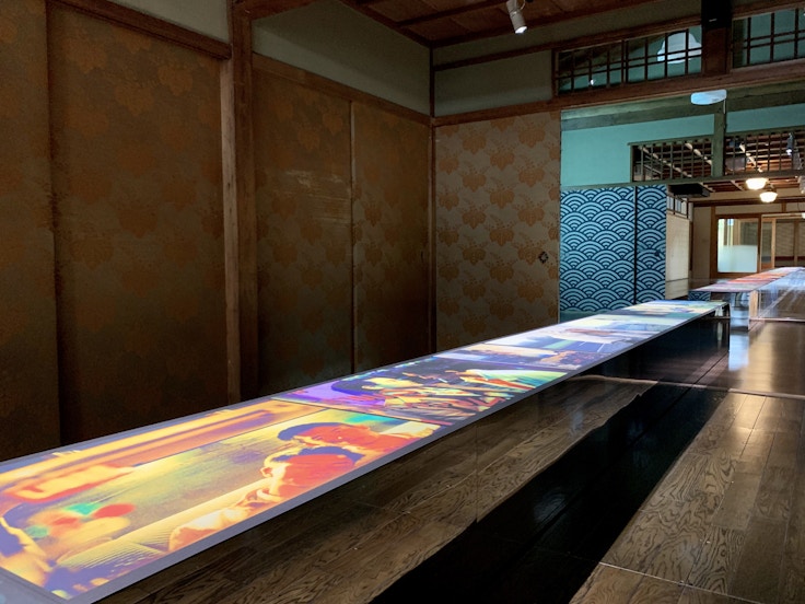会場となる誉田屋源兵衛は江戸時代から続く老舗の帯匠。展示をデザインした遠藤克彦建築研究所は、奥へと細長く伸びる町屋の建築様式を生かしつつ、「帯」からもインスパイアされた空間を生み出した。写真は一直線に並んでおり、展示台の側面をミラーにすることで、作品が空間に浮いているような効果が生まれている。絵巻を見るように、色鮮やかなシャの写真を堪能したい。