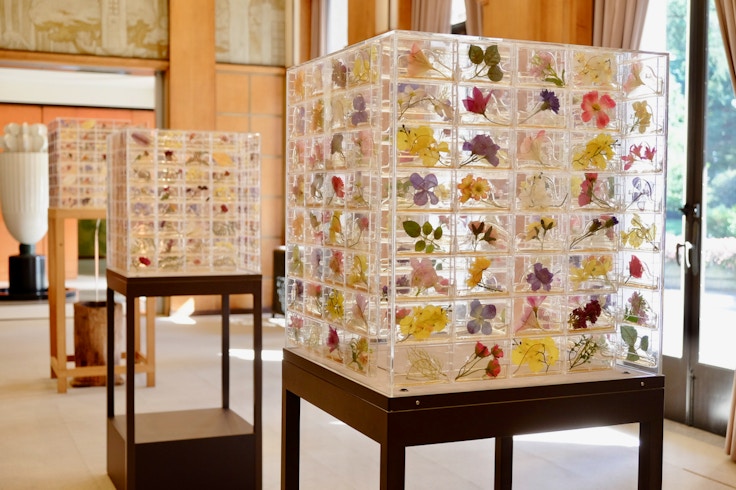 花や種子を天然樹脂で固めた「カセットプラント」シリーズの制作で知られる山口啓介は、南側の窓より自然光がふんだんに入る本館の大客室で《香水塔と花箱》(2020)を展示。ほかにも本館から新館を結ぶエントランスでも同様の作品《花波ガラス》(2020)を展示しており、華やかながらも自然と人工の対比を象徴的に描き出している。