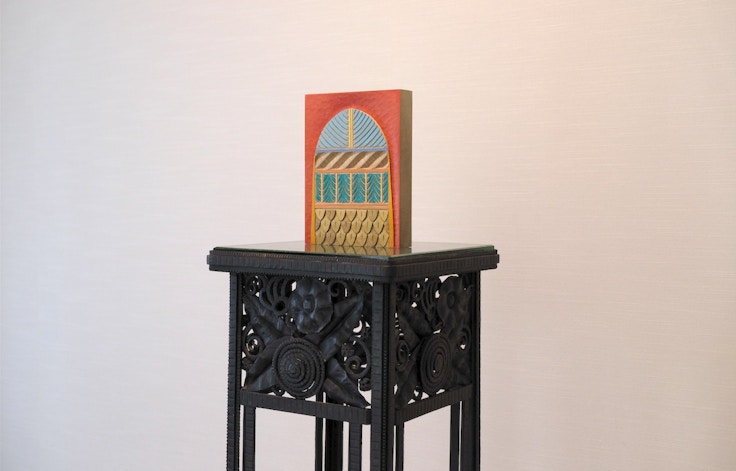 今回、佐々木は経年変化がほとんどない新素材を使用したレリーフ作品を制作。伝統的な左官材が天井や床に使われている邸宅内に永続的な素材が持ち込まれることで、新たな響きを生んでいる。また、レリーフ作品と対になるように部屋に展示された木彫作品も、素材の質感が生み出す知覚について、多くの気づきを与えてくれる。