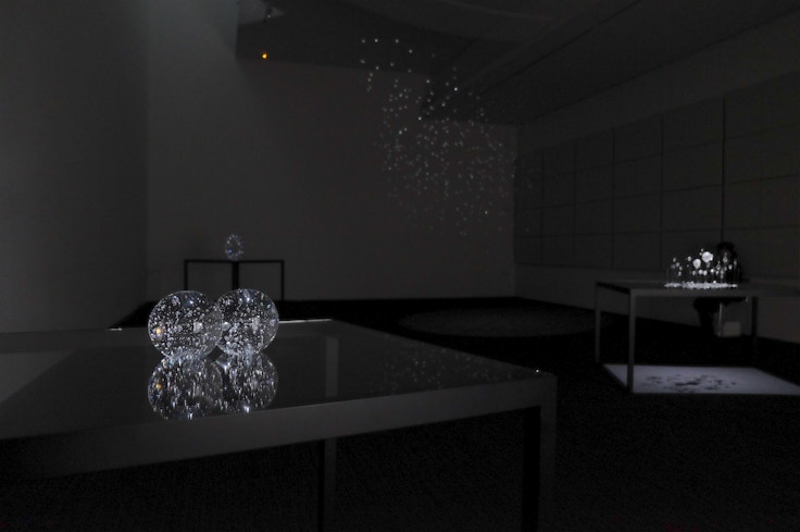 また、新館で展開される《光に始まる 光に還る》(2020)は、暗い空間のなかにガラス玉を浮かべたり、並べられたりしながら光と影をかたちづくったインスタレーション。鑑賞者は室内を回りながら、それぞれのガラス玉に多様な関係性を見出すことになるだろう。
