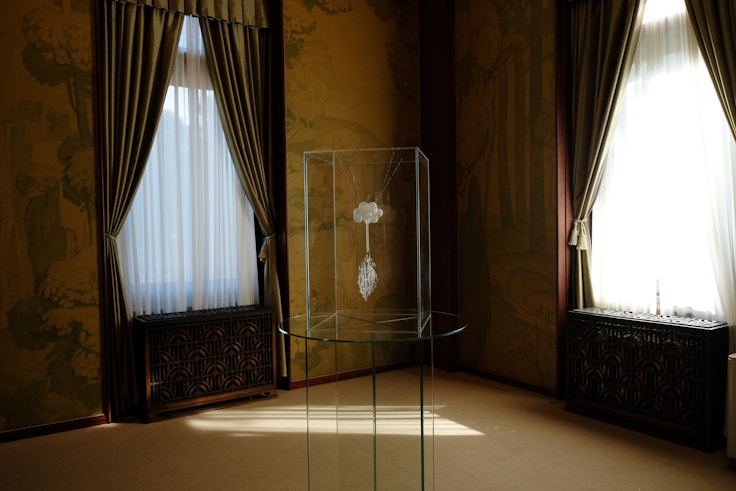 透明なガラスを使用した作品で、見えない世界との関係を問い続けてきた青木美歌。青木が朝香宮妃殿下の居間を舞台に、ガラス作品を家具とともに展開した作品が《光に始まる 光に還る―A room of hidden People》(2020)だ。かつてそこに居た人々への思いを喚起させるように、透明な作品群が輝く。