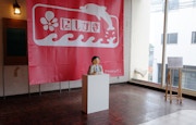 また、室内では田中が昨年制作した映像作品も併せて展示されている。細川ガラシャの絵を背負いながら、夜の味土野を歩きつつ、ガラシャについて書かれた様々な小説を朗読する作品だ。田中は、昨年は人の気配がなく恐れも感じたこの場所で移住者のリサーチを進めたことで、人の「気配」について思考することができたと語った。