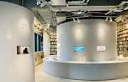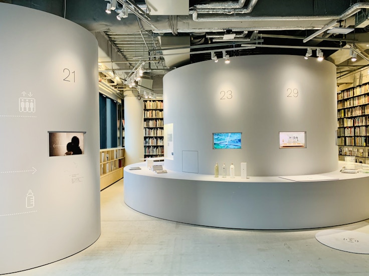 丸い柱が連続する空間は、もともとある日本デザインセンターの円柱を拡張するかたちでデザイン。各展示の冒頭には、入口となる絵図「トビラ絵」を展示し、実物のプロダクトやサイン、編集した映像などを通して、様々な「VISUALIZE」を見ることができる。
