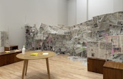 中島佑太の《あっちがわとこっちがわをつくる》は、これまで継続的に行っているワークショップから着想を得た参加型作品。会場の中央には新聞紙でできた人の背丈ほどあるバリケードがそびえ立っており、鑑賞者は両サイドにある紙と筆記用具を使って、「ルール」に関するアイデアを書いて紙飛行機を壁の「向こう側」に送り合うことができる。向こう側から送られてきたルールを守る理由を考えながら、修正案などを書いて送り返すというものだ。