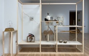 展示室1では、片岡+岩竹は展示空間をひとつの装置として見立てた。片岡が手がけた、日用品に重力や磁力などの物理的なエネルギーを加えて動きを見せるインスタレーション作品や、岩竹が博物辞典や切手などの断片を組み合わせ、コラージュや写真などの手法で制作した平面作品を展示している。