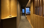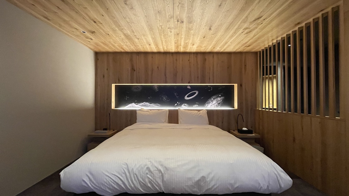 ホテルのロビー・レセプションエリアでは、非日常的な空間をつくり出すインスタレーション作品やパブリックアートを多く手がける大巻伸嗣の作品《Gravity and Grace -ゆだま-》と《Echoes Crystallization》が存在感を放つ。大地の力や記憶を湯玉のかたちで表現した前者は太陽のように光を放ついっぽうで、絶滅種や絶滅危惧種の植物が描かれた後者は、月のように前者の光を反射する。