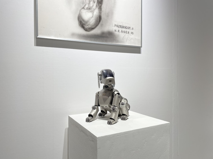 この作品と対比して見てほしいのは、その反対側に展示されている空山の《AIBO》(1999)だ。「AIBO」は、1999年にソニーが発売した世界初の家庭用エンターテインメントロボットで、空山はその初代デザインを手がけた。シルバーメタリックの未来的な犬型ロボットは、エイリアンとは同じような姿勢をしているものの、それが見せた表情はまったく違うだろう。
