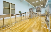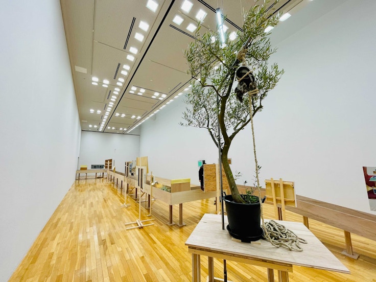 会場では、木材で組み立てられた空中通路がすべての展示室をつないでおり、作品はその左右に配されている。作品を壁に掛けるという従来の絵画作品の展示方法とは異なる、独特の展示構成だ。