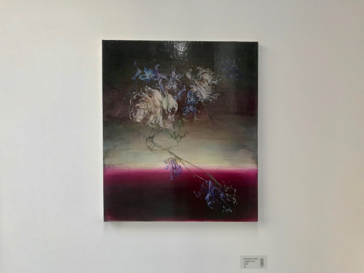 まず1階では、五十嵐大地と森井沙季の作品を展示。五十嵐は1996年東京生まれで、今年、東京藝術大学油画専攻を卒業する。本展では、照明や配置をつくりこんだ静物を撮影し、その写真の上から油彩で描く作品を発表した。