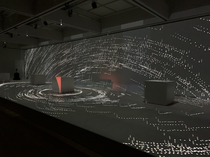本展のハイライトとなるのが、演出振付家・MIKIKO率いるダンスカンパニー「ELEVENPLAY」との共作《multiplex》(2021)。ステージを模した横長の空間には映像がプロジェクションされ、そのなかを立方体が動いている。そして手前の展示室で上映されるのが、ダンサーの動きをモーションデータ化し、この空間にAR的に合成した映像だ。リアルな表現をバーチャル空間にも展開する技術は、ライゾマの真骨頂といえる。