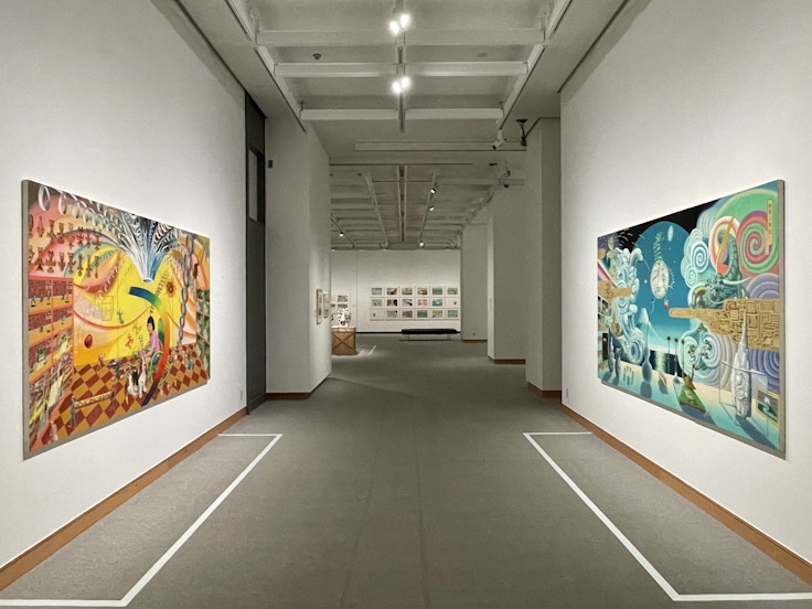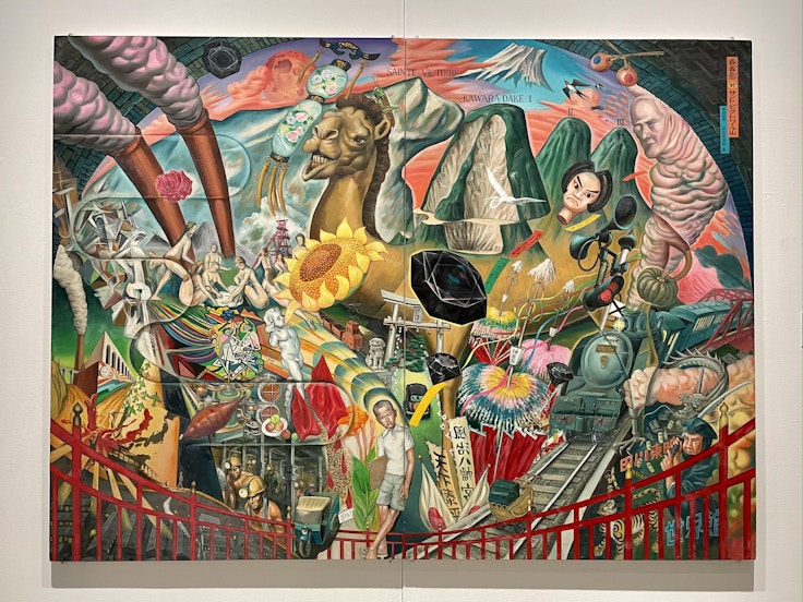 次の章では、立石が帰国後に制作した代表作でもある、中原佑介によって「大河画三代」と命名された《昭和素敵大敵》《明治青雲高雲》《大正伍萬浪漫》(いずれも1990)が大きな存在感を放つ。平成時代の切り替わりに制作されたこれらの作品では、日本近代の3つの時代を横構図の長大な画面で表現。各時代の著名人をはじめ、政治、経済、社会、生活、文化などに関する様々なイメージが、巻物のように画面右から左へと配置される。これまで立石が蓄えてきたアイデアや思考、体験も含まれたこれらの作品とじっくりと向き合ってほしい。