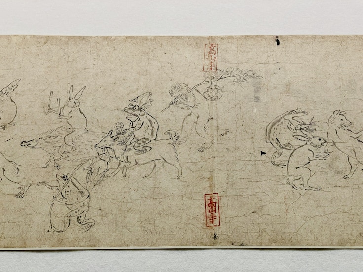鳥獣戯画は平安時代・12世紀に描かれたもの。甲・乙・丙・丁の4巻からなり、全長は44メートルにおよぶ大作だ。それぞれに動物や人間たちの個性豊かな姿が描かれており、そのユーモラスな姿は人気が高い。