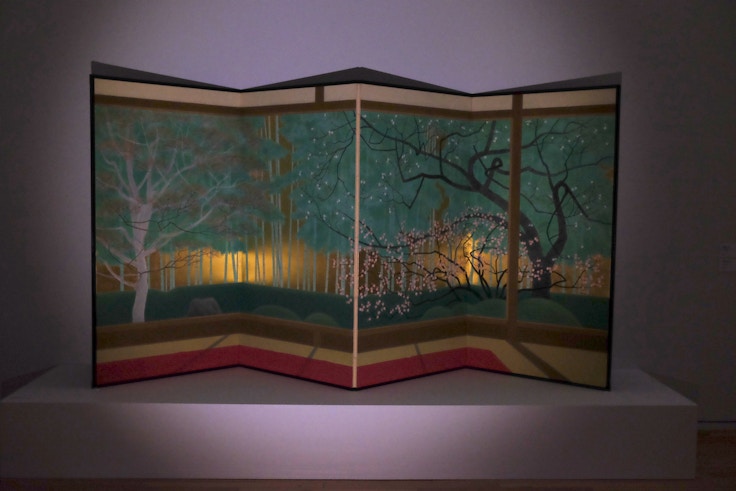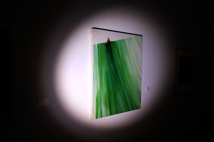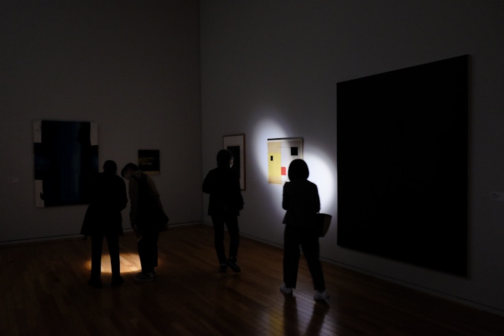 4つ目の章となる「PANORAMA パノラマ」では比較的大型の作品が展示される。一度にライトで照らせる範囲には限界があるため、大型作品の全体に光を当てながら観覧することは難しい。結果的に部分をスポットライトを当てるように見ていくことになる。並木功や大野俊明の屏風絵や李禹煥の大型絵画などの全体像を、細部からとらえるという稀有な体験ができる。これも、ガンダーの狙いなのかもしれない。