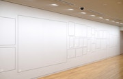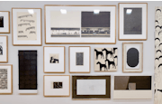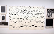 4階の「色を想像する」では、所蔵品のなかから白と黒のモノトーンの作品のみが展示された。壁一面に敷き詰めるように作品が掛けられ、反対側の壁には各作品の情報が対になるように実寸で掲示されるという、独特の展示方法だ。