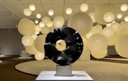 「あかり」のインスタレーションの前に、ノグチが香川県牟礼町の石匠である和泉正敏のサポートによって制作した石彫《黒い太陽》(1967-69)が置かれている。アメリカ・シアトルのアジア美術館正面に設置された同名の野外彫刻の習作として制作されたこの作品は丹念に磨き上げられ、掘り込まれた凹凸によって光が変わり、作品自体が回転しているように見える。