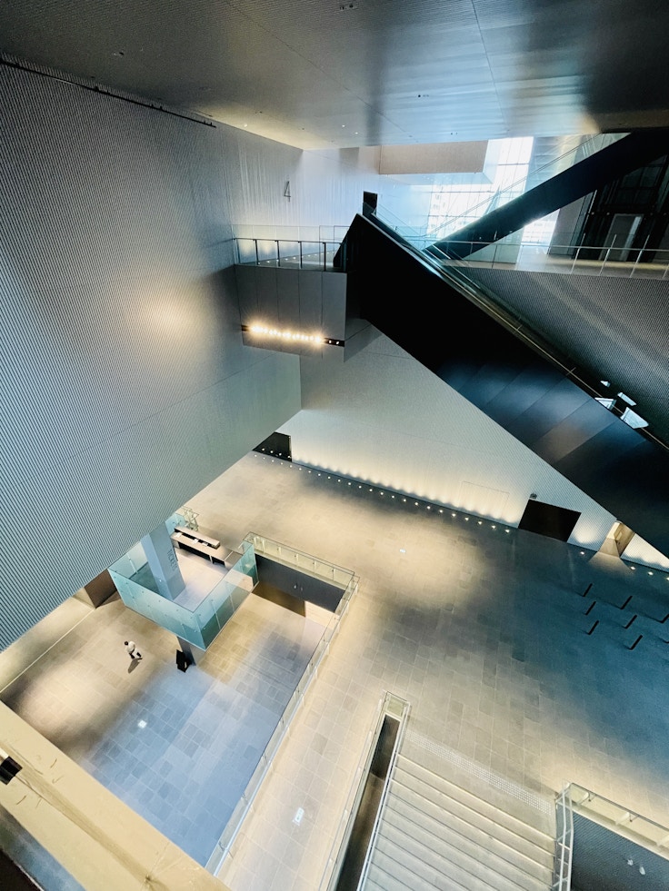 1階あるいは2階から入館した来館者は、長いエスカレーターに乗って展示室フロアへと上がることになる。4〜5階は一筆書きで展示室を回れるような構造となっており、柱がないことも手伝って、ゆったりとした印象を与える。