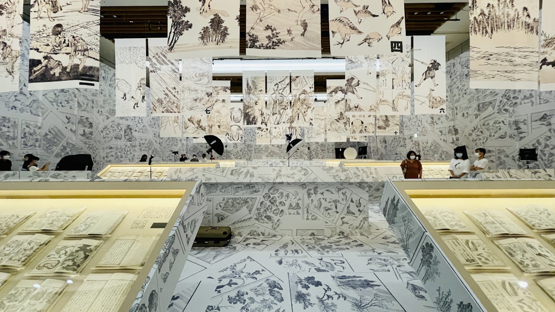 このなかでも、もっともボリュームの大きい《北斎漫画》は、その全頁を同時に展示するために約500冊が勢揃いした。会場には、「北斎漫画の森」ともいえる空間が展示室に出現。床から什器、壁にいたるまで北斎漫画のモチーフが散りばめられており、「北斎の頭の中」に没入するような体験ができる。