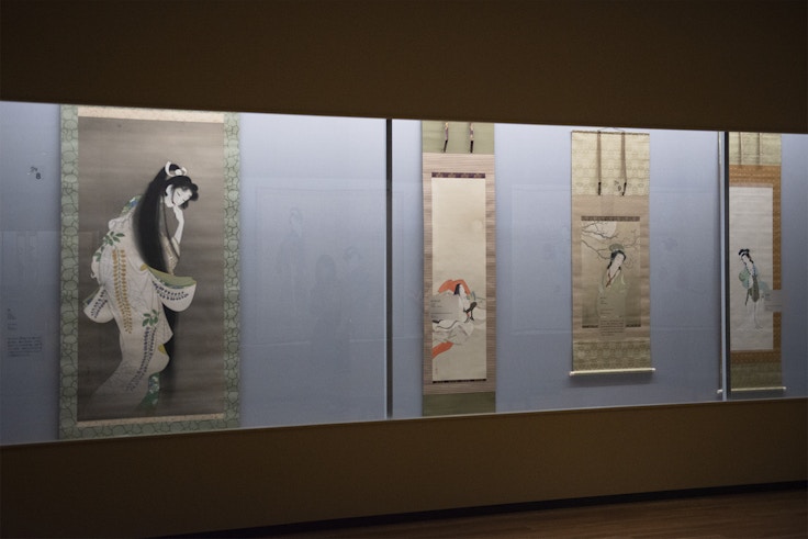 続く第3章「模索—画壇の流行から伝統の古典へ1913-1926」では、先述の批評から、描かれた女性の心理描写に取り組んだ作品が数々展示されている。《舞仕度》(1914、前期展示)に描かれているのは、舞の出番を待つ舞い手の女性と、その背後で備える3名の囃子手。舞い手の緊張した面持ちとくつろいだ雰囲気の囃子手の対照的な様子が、描かれた人物の内面を想像させる。またこの時期、松園は能楽師・金剛巌に師事して謡曲を始めており、謡曲「葵上」の六条御息所が嫉妬の炎に燃える形相を《焰》(1918、前期展示)に描くなど、絵画作品のモチーフとしても芸能がたびたび登場する。松園の孫にして日本画家である上村淳之は「この頃の松園は、怨霊や天女のように架空の存在を描くことで、存在とは何か、リアリズムとは何かという問いの答えを探り、結論を出せずに過ごしたようだ」と話す。