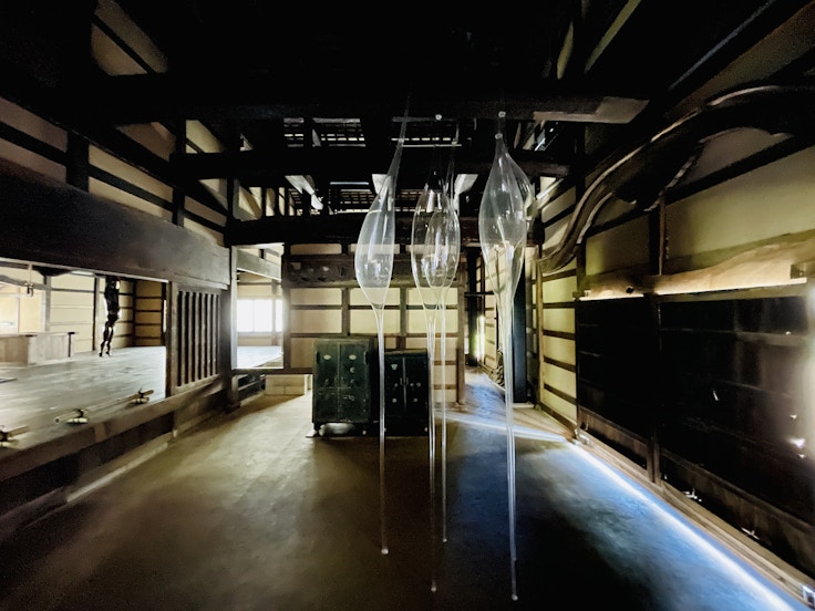 3万平米の広大な境内を誇る勝興寺では、四代 田辺竹雲斎をはじめとする11名が大広間や台所など重要文化財で作品を展開。