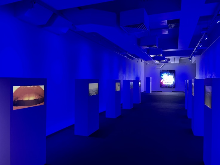 会場のエントランスは赤いベルベットで覆われており、導入部として次のプロローグ展示室へとつながる。赤いカーテンを経由して空間全体が青く映されているこの展示室には、10台のモニターが設置。1台につき31点の写真がスライドショーで映されており、奥には蜷川の言葉「Floating Layered Visions」が綴られる作品が展示されている。