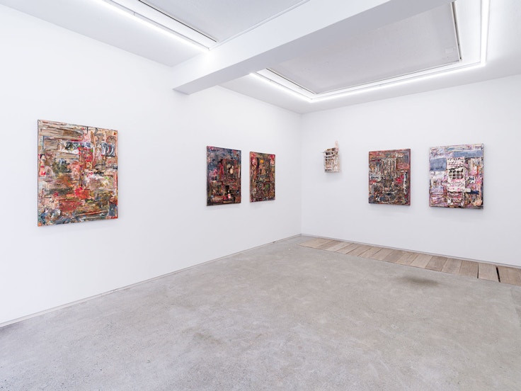 大竹の作品に通底するのは、「貼る」という行為とも言える。Take Ninagawaのオーナーである蜷川敦子は、「大竹さんの『貼る』というのは、ただ表面的に画面構成しているのではなく、拾ってきたモノや音や光など、その素材が持つ時間や記憶ごとアーカイブしている」としつつ、「『残景』は、その上に絵の具でマチエールをつくり彼自身の心象風景を最終的に仕上げているというのがとても特徴的だ」と話す。
