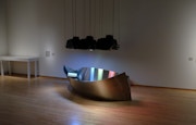 《河》(1979-81/2020)は、折り紙の笹舟を模した金属彫刻の中の水が波打ち、そこに逆さ吊りにされたモニターの映像が映り込んで絶えず揺れ動く作品だ。川は久保田にとって変化し続ける世界の象徴であったといい、同作では水という有機的な存在を作品に取り込む久保田の手つきに触れることができる。