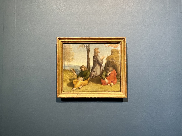 ルネサンスの巨匠ラファエロ・サンティの《ゲッセマネの祈り》(1504頃)は、磔刑への恐れに苦悩しながら神に祈るキリストと、眠り込んでリラックスする弟子たちの姿が描かれたもの。ラファエロが20〜21歳頃に描いた同作では、その初期の繊細優美な作風を堪能できるだろう。