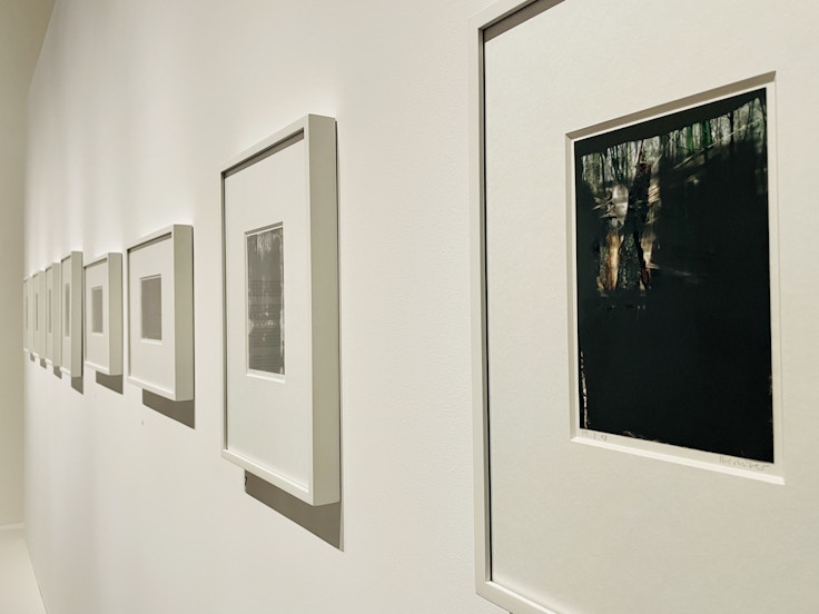展示冒頭を飾るのは、写真にペインティングを施した作品群。「Grauwald(グレイの森)」シリーズと《28. April '05》《29. April '05》(ともに2005)は、ともに白黒またはカラー写真のプリントに重ね塗りをほどこしたもの。支持体となった写真のモチーフはほとんど絵具で覆われており判別が難しいが、それがかえって想像力を掻き立てる。