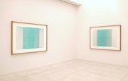 平面作品のシリーズ「私は存在するだけで光と影がある」は、鮮やかな青緑色が印象的な作品だ。本シリーズは特殊な技法によって均一に塗布した水性染料が自然光によって退色し、グラデーションが生じている。退色という概念を絵画に取り入れ、そのことにより素材性が改めて強調されている。