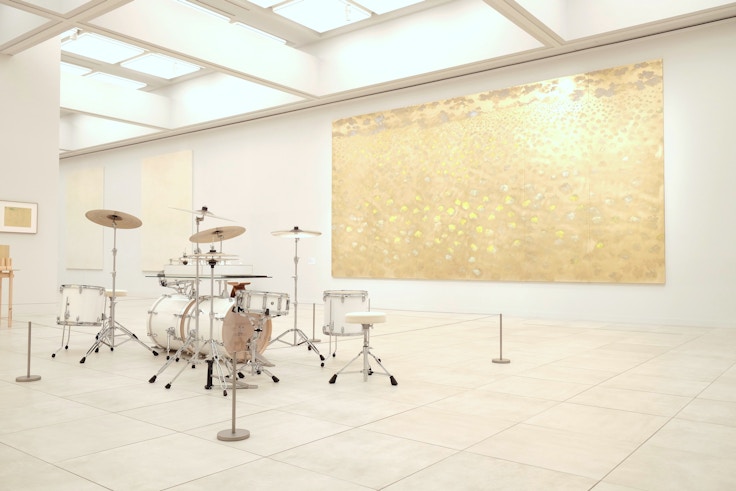 また、ドラムを囲うように展示された金色に輝く平面作品群は「私にはすべては光り輝いて映る」と銘打たれている。真鍮に特殊な加工を施し、オイルパステルや油彩、鉛筆でドローイングを行った本作は、いずれも作家の視線の動きをトレースするように描かれている。真鍮が跳ね返す光と作家の視線が交錯するようだ。