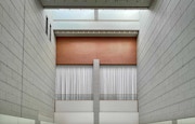順路に沿って展示室内に進むと、企画展示室中央の吹き抜けに水が張られた巨大なインスタレーションが出現する。水の底には白い砂が敷かれ、壁面に張られた鏡が水を反射、空間には広大な水面をつくりだしている。