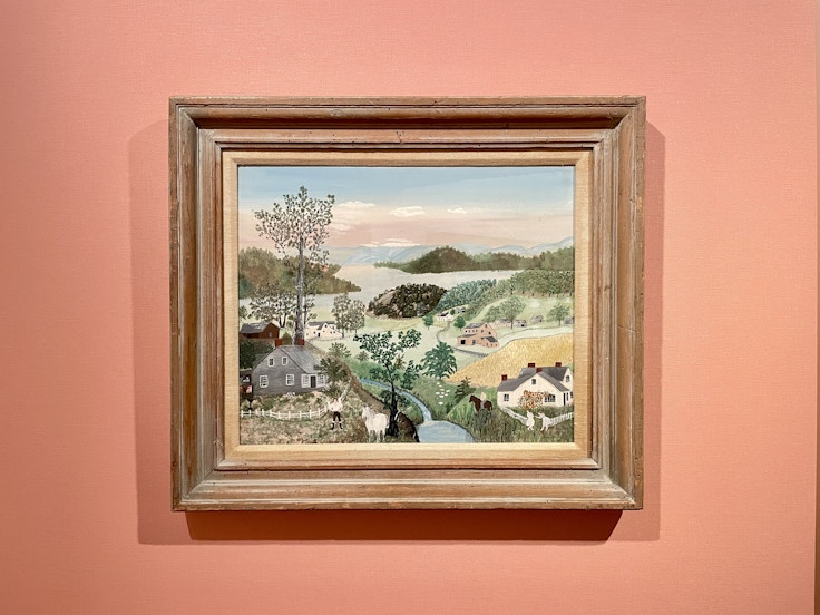 終章となる第4章「美しき世界」には、豊かな自然を題材とした作品が並ぶ。なかでも注目したいのは、1948年に制作された《美しき世界》だ。うっすらとピンクがかった空と農村風景を描いた本作。本展を担当した世田谷美術館学芸員・遠藤望は「グランマ・モーゼスの自然観が表された作品だ」と評する。またここではモーゼスが101歳を目前に描き、結果的に絶筆となった《虹》が展示の最後を飾る。