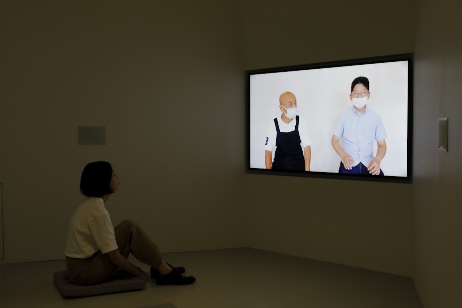 他者とのコミュニケーションの複層性を、主に映像作品によって扱ってきた百瀬文。本展では、その代表作のひとつとも言える《聞こえない木下さんに聞いたいくつかのこと》(2013)が展示されている。