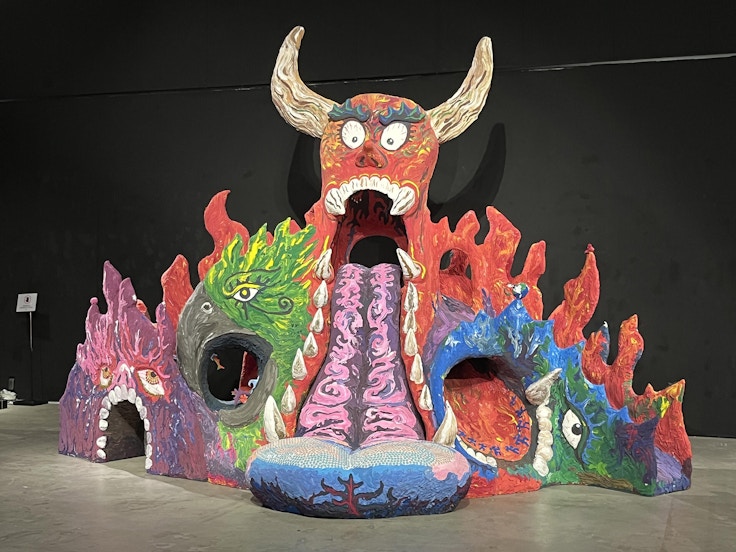 地獄の鬼の口がすべり台になっている本作。残念ながら実際に滑ることはできないが、舌には座ることができ、裏に回ると、登って口から顔を出せる階段がついて、絶好のフォトスポットになっている。