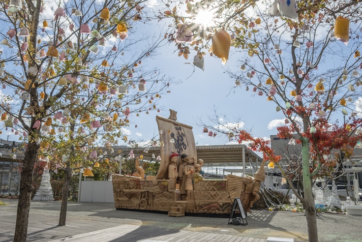 宝船のとなりには、先述した髙橋匡太によるワークショップの成果「7市町のひかりの実」が、街路樹にびっしり実っている。市民の手で笑顔を描かれた果実袋がライトアップされると、一帯は微笑ましくも幻想的な雰囲気に包まれる。