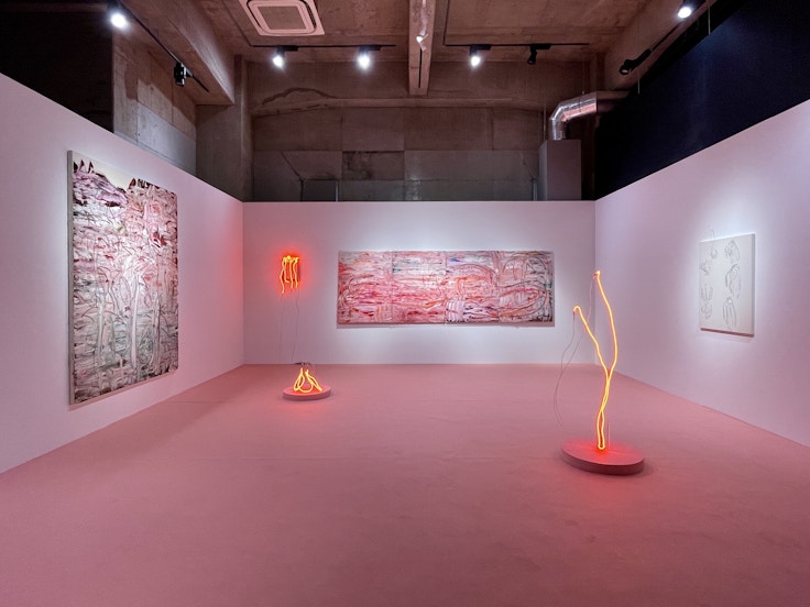 川内理香子は、内と外の境目のなさが暗喩される神話をモチーフにした、自然と動物、身体が入り混じる世界を描いた油彩のペインティングや、針金の半立体、ネオン管の彫刻を制作し、様々な線のあり方を示した作品群を発表した。