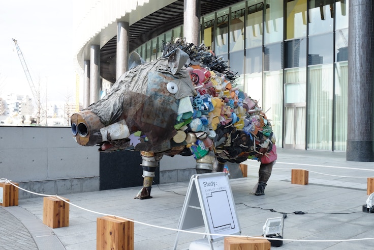 グランフロント大阪の1階、JR大阪駅に面した「うめきた広場」に設置された奥中章人《INTER-WORLD/SPHERE: Cocooner》(2022)は、虹色に輝く半透明の風船を使った作品だ。本作は自由に触ることができ、かたちや反射する光を変化させる本作で、奥中は人やもののが互いに関係しながら変化するさまを本作で表現したという。また、その隣には淀川テクニック《真庭のシシ》(2018)も展示されている。作家の故郷である岡山・真庭市による依頼で制作されたこの作品は、同市に生息するイノシシをモチーフに、プラスチックや金属のゴミなどでつくりあげたものだ。