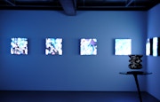 2階では落合陽一がNFT作品《Re-Digitalization of Waves》を発表。本作の原型となったのは、空中に浮遊する鏡面の彫刻が風景を切り取って回転し、人間の魂と風景を写し取るインスタレーション《借景,波の物象化》だ。この物質的なインスタレーションをオールドレンズとデジタルカメラを用いて映像として撮影し、動きのある視覚的なNFTとして再度デジタル化した作品群。本作は、展示室のQRコードから購入することも可能となっている。