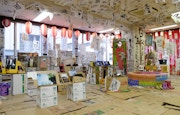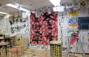 3階では釜ヶ崎芸術大学が巨大なインスタレーション《10年、卒業しない》を展開。NPO法人「こえとことばとこころの部屋(ココルーム)」が運営する釜ヶ崎芸術大学は、2012年に大阪市西成区釜ヶ崎にて開講。日雇い労働者の街として知られる釜ヶ崎の街を大学に見立て、地域のさまざまな施設を会場に展開するゆるやかなプロジェクトだ。